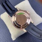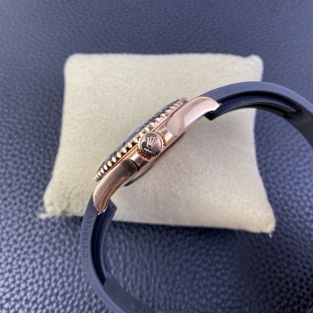The “Everose” & Stealth Black Aesthetic: The entire case and heavy Oysterlock clasp are heavily plated in rich 18K rose gold. VSF has masterfully perfected this warm, copper-toned “Everose” hue to exactly match genuine Rolex gold. This wealthy, warm metal creates an incredibly striking, aggressive contrast against the matte black bezel, dial, and rubber strap.
