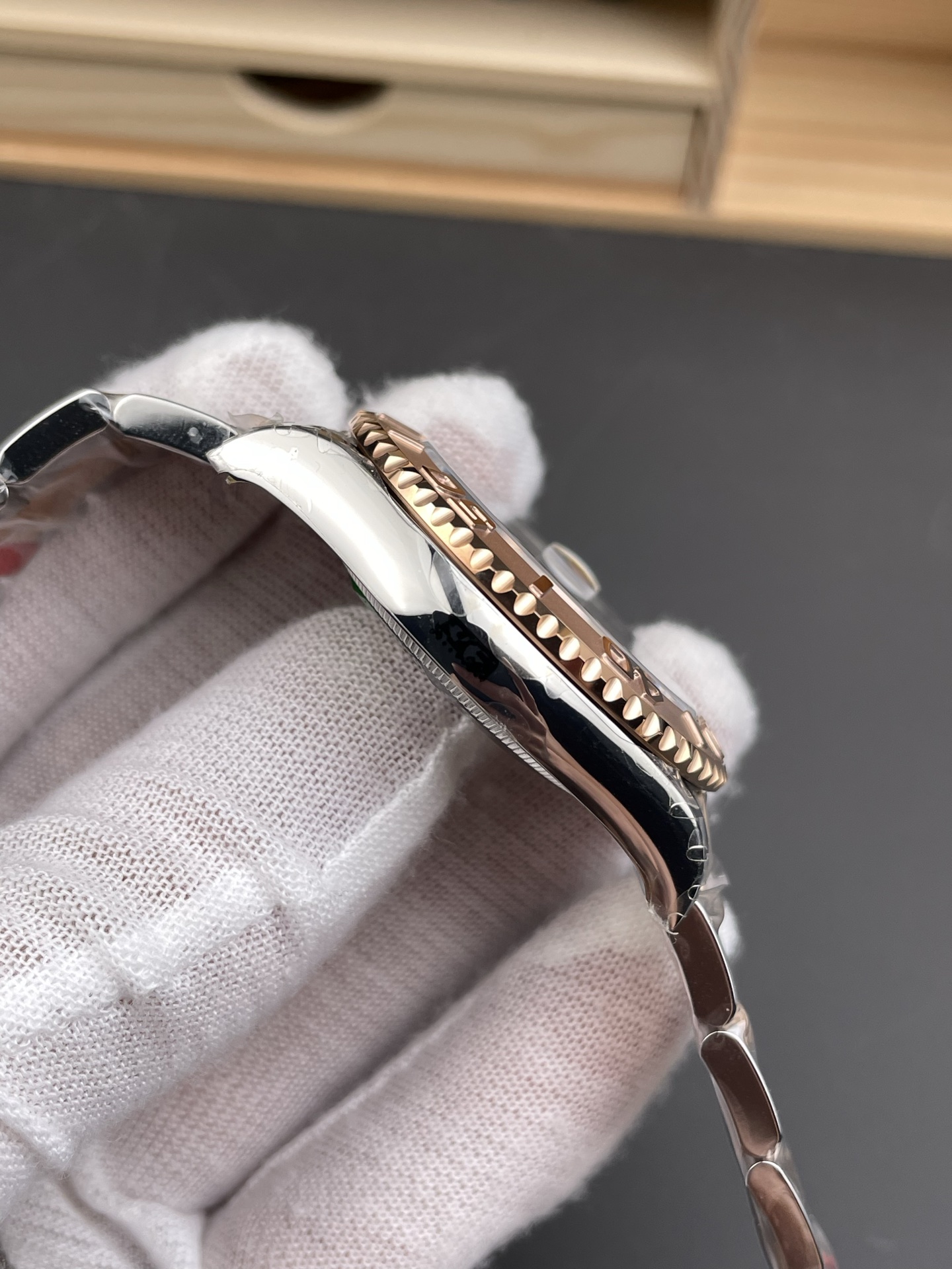 The “Two-Tone Rose Gold” Aesthetic: The outer links of the Oyster bracelet and the main case are forged from durable, highly polished 904L Oystersteel, while the entire relief bezel, winding crown, and broad center links are heavily plated in rich 18K rose gold. VSF has masterfully perfected this warm, copper-toned “Everose” hue to exactly match genuine Rolex gold, completely avoiding any overly pink or brassy tones.