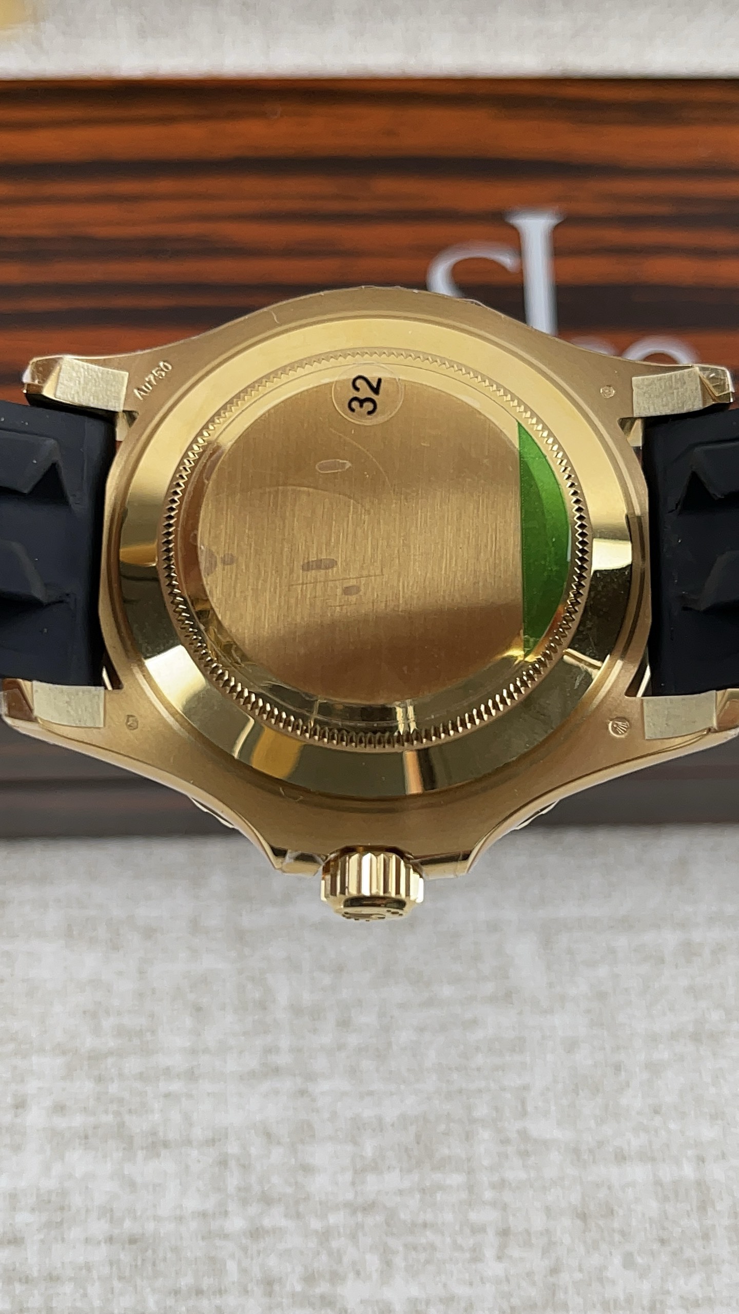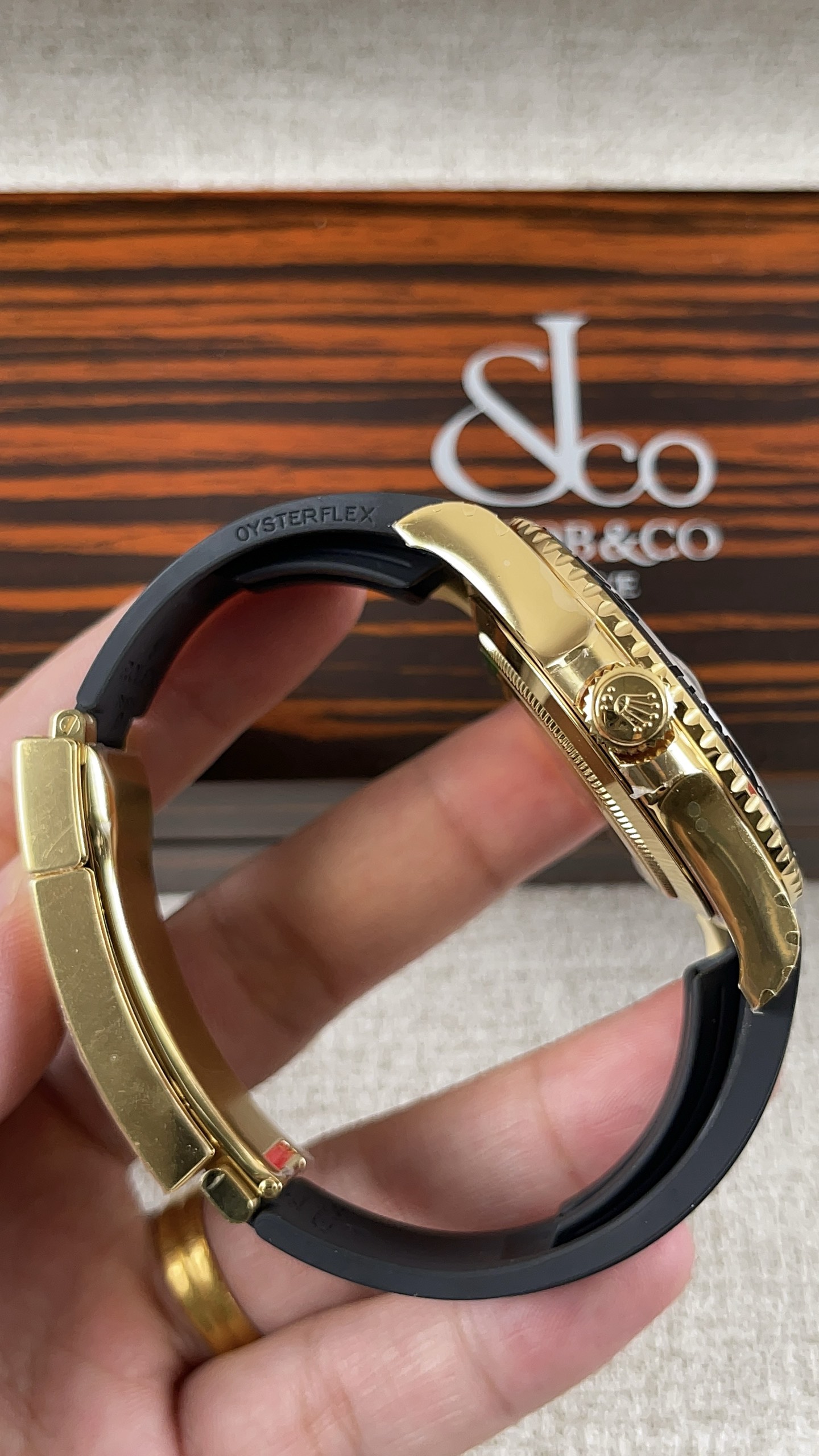 Strap: Custom Black Oysterflex Bracelet (High-Performance Elastomer) with 18K Yellow Gold Plated Oysterlock Safety Clasp