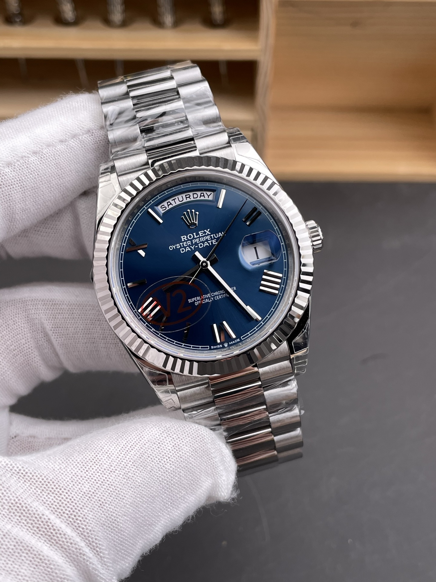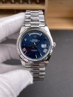 Product Overview The Rolex Day-Date 40 (Reference 228239) is the undisputed symbol of prestige, universally recognized in boardrooms across the globe as the “President’s Watch.” Flawlessly executed by the highly revered VS Factory (VSF), this newly upgraded V2 super clone replicates the heavy-hitting 18K White Gold configuration, substituting it with premium 904L steel polished to a brilliant, white-metal mirror finish. The absolute centerpiece is the breathtaking Blue Sunburst dial featuring modern, multi-faceted applied Roman numeral hour markers and the iconic spelled-out day window. Mounted on the legendary semi-circular President bracelet and framed by a light-catching fluted bezel, this piece is the definition of commanding, authoritative luxury. Powered by VSF’s custom VS3255 automatic movement, it fully replicates the authentic day and date flip mechanics, delivering a completely flawless wrist presence.