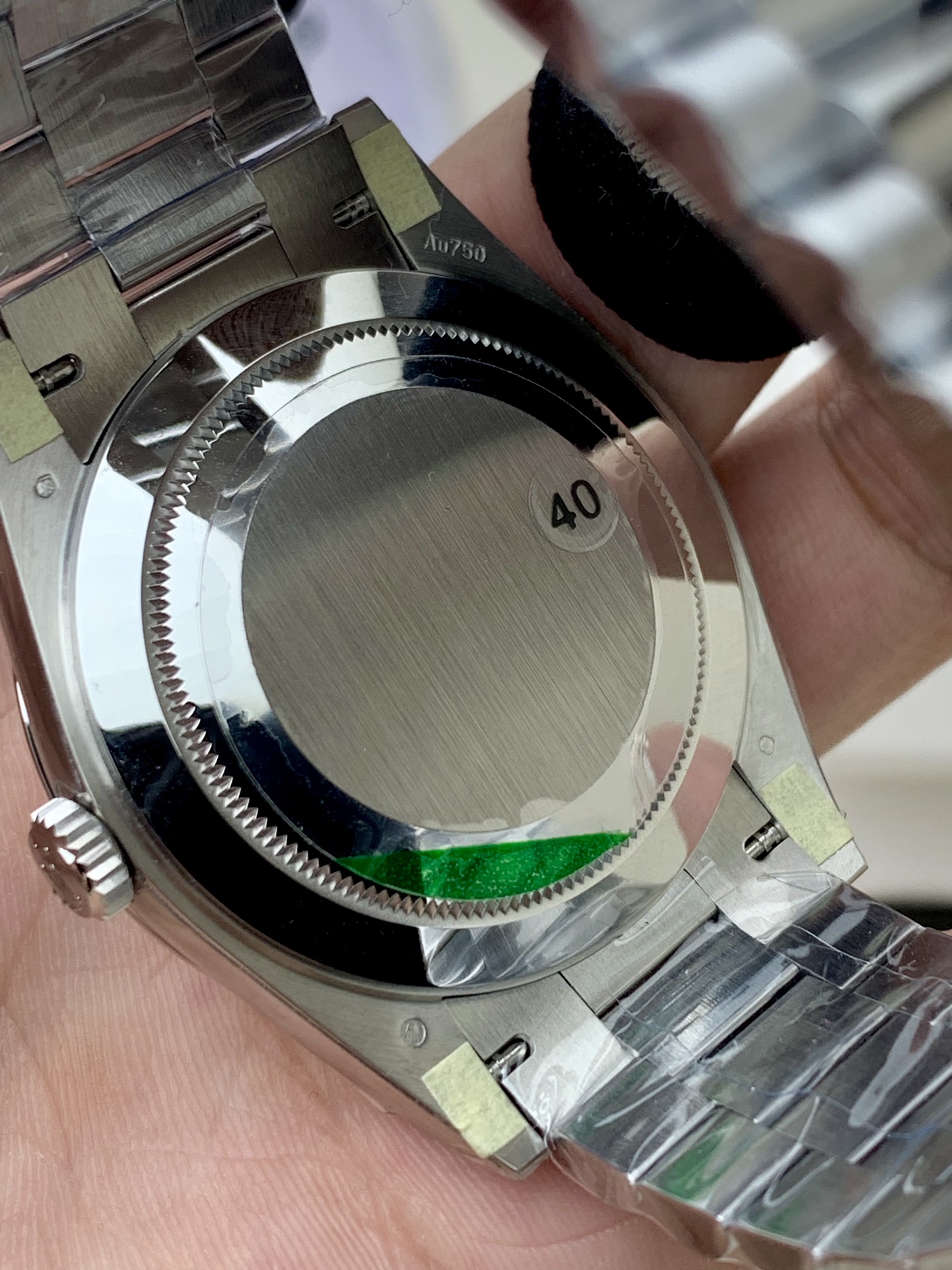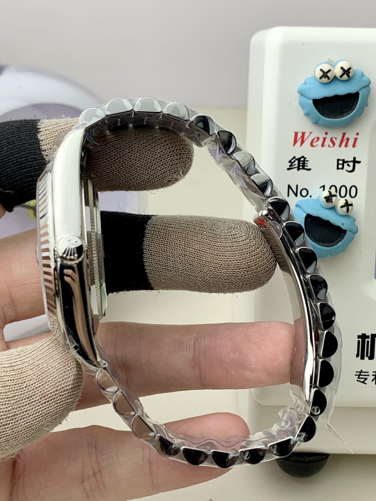 • Commanding 40mm Case Profile: The modern 40mm case offers the perfect balance—slightly more refined and compact than the Datejust 41, yet delivering massive wrist presence. The polished finish across the 904L steel is expertly executed by VSF to mimic the heavier, warmer luster of genuine solid white gold.